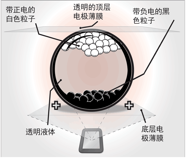 电子纸显示材料夹在透明的上层电极和下层电极之间,该显示材料中有带电荷颜色粒子。在外加电场的作用下,这些粒子能在电极之间上下移动,从透明的上层电极可以看到黑白的变化。
