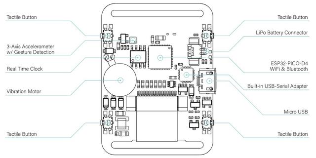 其中,微控制器选择的是乐鑫ESP32-PICO-D4模块(下图红色部分),ESP32芯片集成了2.4G无线和蓝牙功能。