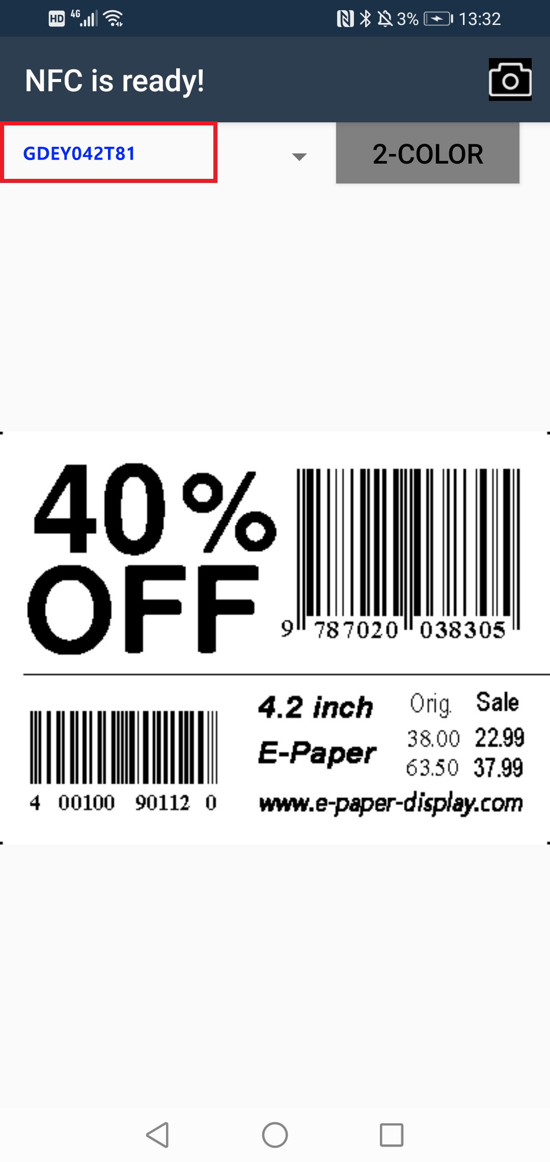 GDN042BW电子墨水屏标签采用先进的NFC通讯及取电技术,同时该电子墨水屏标签配备了手机APP软件,用户可以通过这个软件直接在手机上对当前的显示画面进行更新。这种设计简化了更新过程,用户无需进行取模操作,只需将需要显示的图片导入软件即可。通过NFC通讯和手机APP软件,用户可以实现对电子墨水屏标签内容的即时更新,这对于需要频繁更改显示内容或实时更新信息的应用场景非常有用。采用这种通讯方式,使得用户操作更为便捷,不需要专业的技能,普通用户也可以轻松地更新并控制显示内容。此显示展板充分利用了电子纸的双稳态特性,无需内置电池,显示画面可以长期稳定地保持。