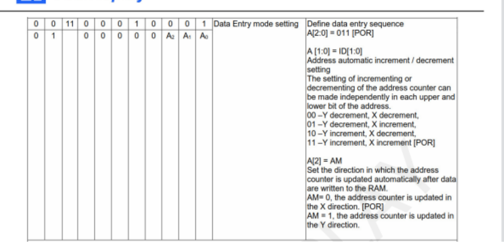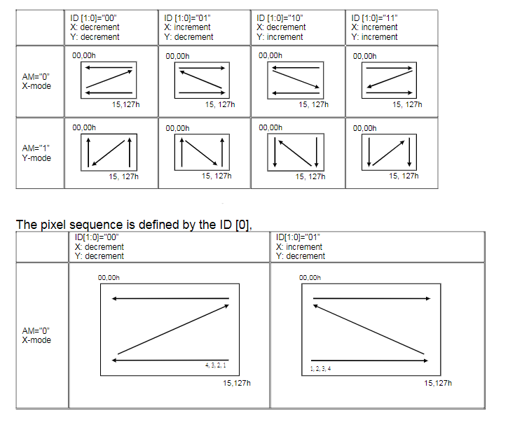 - ID[0]=“1”时,将数据写入RAM后,X地址计数器将自动增加1。