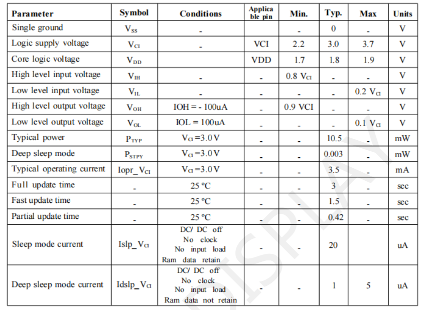 有关SPI以及这款墨水屏的SPI通信配置,具体您可以参考规格书的6.3 Panel AC Characteristics