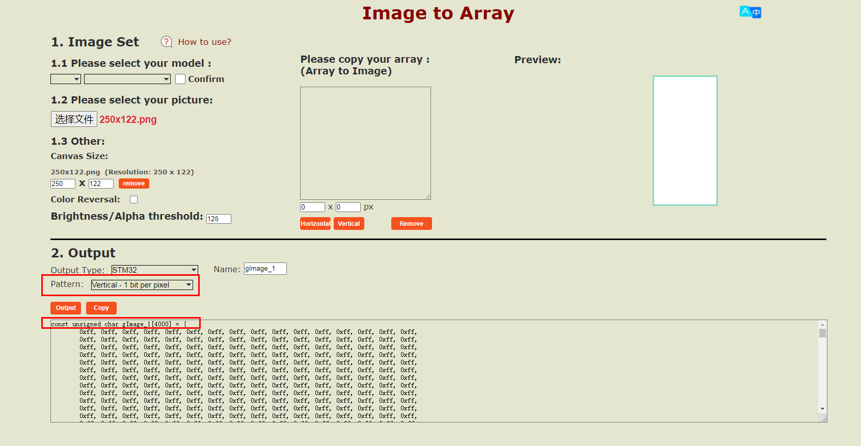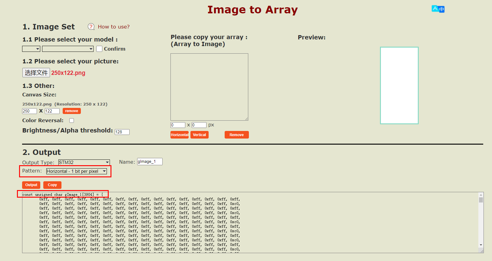 所以,您首先需要进行图片取模,图片的分辨率必须是250x122,然后按照图片取模说明文档的步骤进行操作(配合Image2LCD软件使用);您也可以直接使用Good Display的在线工具-ImageToArray,这样您只需要确保图片分辨率满足250x122,图片格式支持jpg, png。