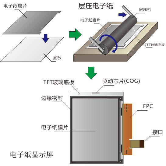 电子墨水被涂布在一层塑料薄膜上,再贴覆上薄膜晶体管(TFT)电路,经由驱动IC控制,形成像素图形。